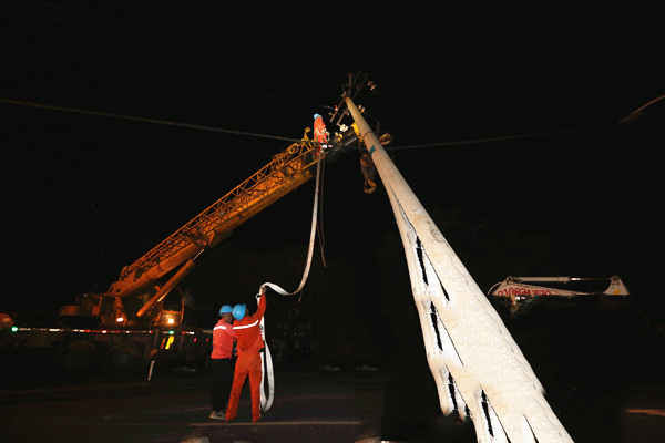 很快,供電公司搶修隊伍也緊急到達現場,現場清理完畢后,搶修人員立刻著手做現場安全措施,待4部搶修車輛全部到達現場時,搶修人員已做好一切安全措施,斷桿更換工作立刻開始。搶修人員合力將電桿割斷,而要把斷桿挖出可不是那么容易。因為事故現場位于學校門口,地面下層有堅固水泥層,開挖難度較大,搶修人員借助打樁機和鐵鍬,經過半個多小時的施工,才成功將斷根挖出。隨后,借助起吊設備,搶修隊員將新桿立于原處,從吊離斷桿、拆除斷桿上橫但和導線,到運桿、挖桿坑、立桿、重新安裝橫擔和架線......