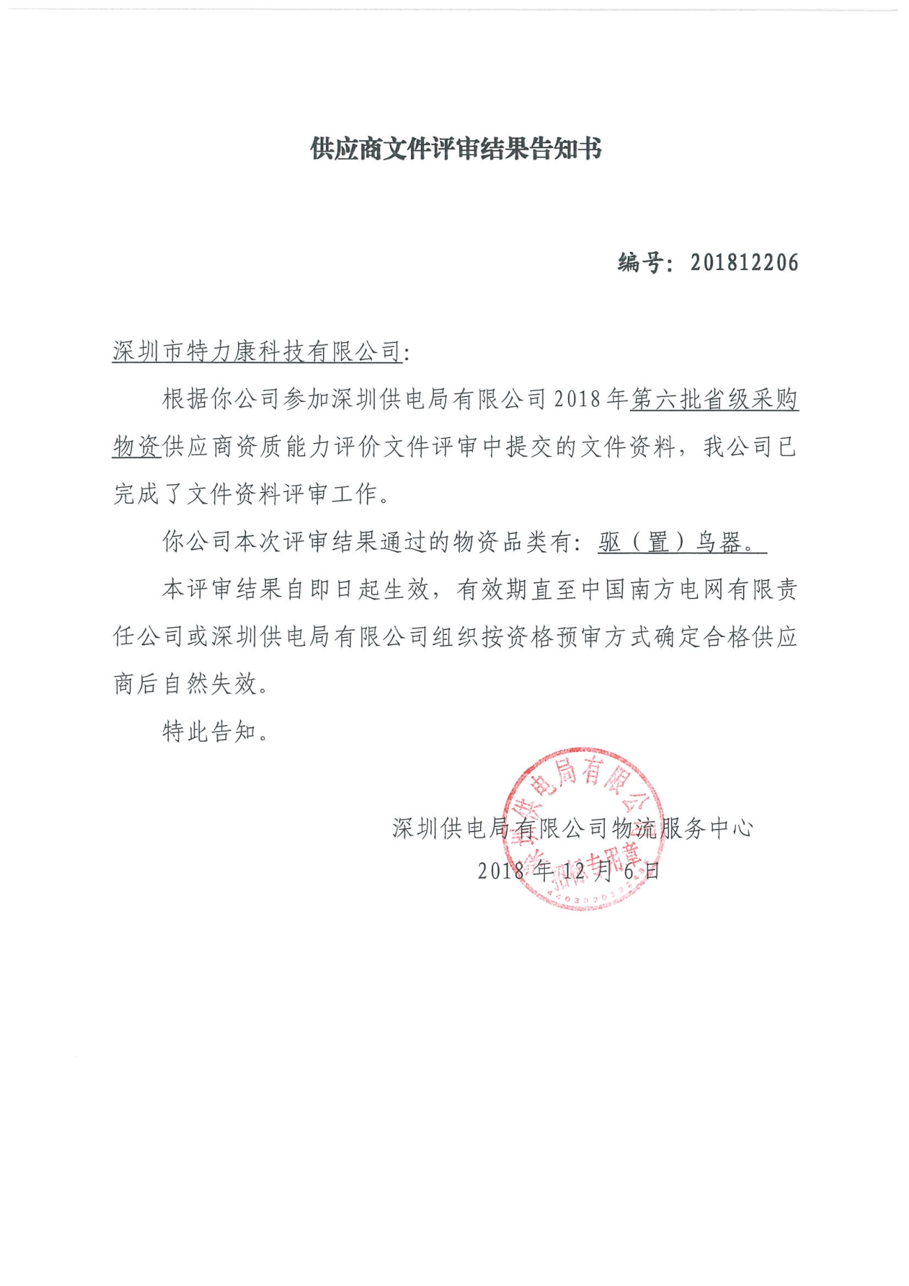 南方電網深圳供電有限公司2018年第六批驅(置)鳥器框架項目評審工作已結束,經評審委員會評審,經南網深圳電力公司招投標領導小組批準,我司被確定為此次驅(置)鳥器框架中標單位現將公告公示。